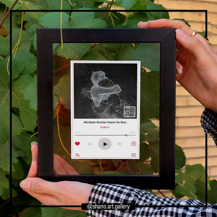 یکی از کارای پرطرفدار هستش فقط کافیه آهنگ مورد علاقه تون رو به ما بگید تا بصورت یه تابلوی شیک خاطراتتون رو باهاش ماندگار کنیم. قابل اجرا در هر سایز دلخواه (از سایز ۱۵×۲۰ تا سایز ۱۰۰×۷۰ ) چاپ با بالاترین کیفیت رنگ قاب: سفید،مشکی،طلایی،نقره ای،طرح چوب کمرنگ،طرح چوب پررنگ ،بژ.