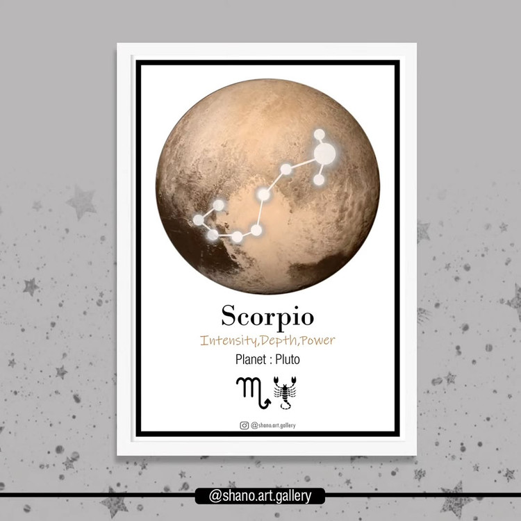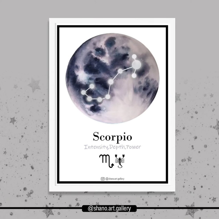 تابلوی صور فلکی ماه «آبان» شامل اطلاعاتی نظیر سیاره ماه تولد صورت فلکی، نمادها، سه خصوصیت اخلاقی متولدین ماه و قابل در ۶ تم مختلف قابل اجرا در هر سایز دلخواه چاپ با بالاترین کیفیت.