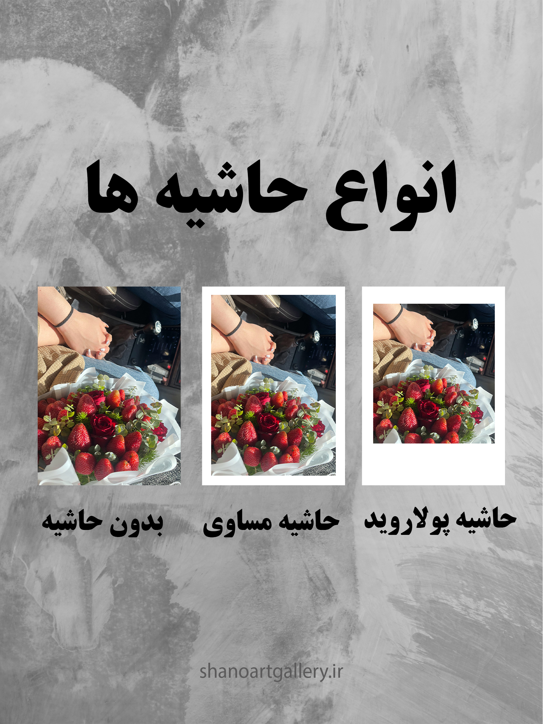 توجه: بعد از اتمام سفارش و مشخص کردن تعداد و موارد دیگه از اینجا (سایت)و ثبت نهایی ، عکسهاتون( و اگر آیتم افزودنی برای عکس انتخاب کردید، متن و اهنگ یا ویس) رو بصورت فایل از روبیکا یا تلگرام به آیدی shanoartgallery یا شماره 09046625351 ارسال بفرمایید.